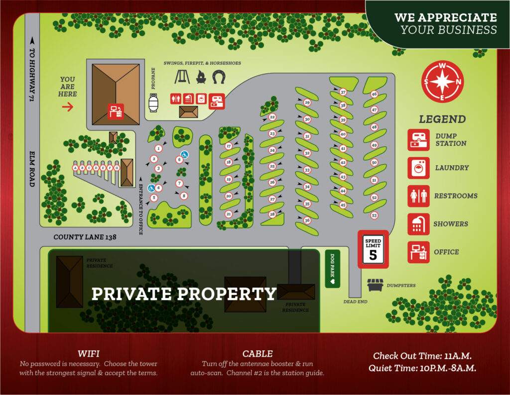 Sites A (Back-in)5,6,8  (5,6,8 have to unhook) &17 (Pull-Through) are Premium Sites- Triple wide, large grassy lawn, large patio, propane grill, personal fire pit & glider